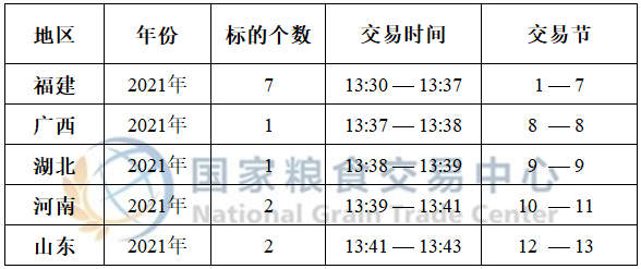 进口大豆于13:30开市交易,请提前登录“政策性粮食轮换交易”交易专场并关注标的,最新预估竞价交易时间如下: